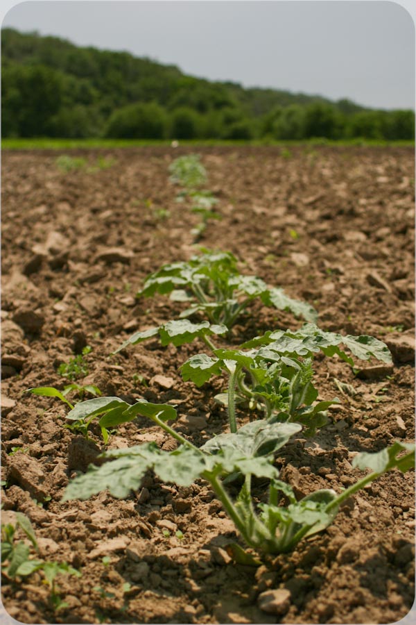 Cantaloupe are looking good too. There are a few rows that got hit by the mice hard and some spots that the water stood too long, where Dad had to replant some by hand. Those rows are going to be a bit behind everything else. Other than that, everything seems to be soaking up the dry and sun well. – Scott